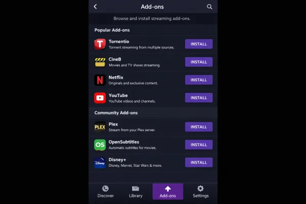 Главная особенность медиацентра — это расширяемая архитектура с поддержкой дополнений (addons). Через специальный каталог можно установить расширения для доступа к различным источникам контента: от официальных стриминговых сервисов до торрент-трекеров, бесплатных видеобиблиотек. Каждый пользователь настраивает программу под свои потребности.