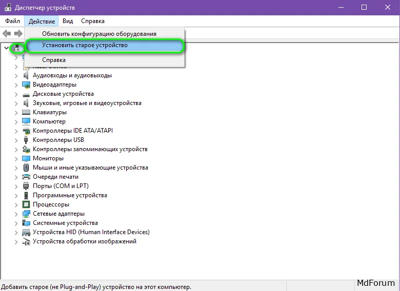 2. Открываем диспетчер устройств. Делаем подсвеченным "ваш компьютер" нажав один раз по "Win-XXXXXXX". Нажимаем "Действие" и выбираем "Установить старое устройство".