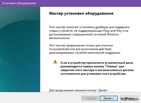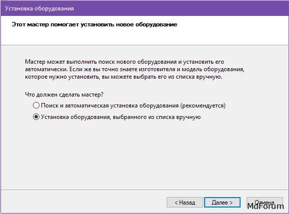 3. Жмём "Далее" -> в следующем окне выбираем "Установка оборудования, выбранного из списка вручную"