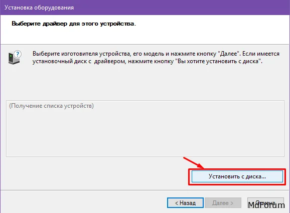 4. Жмём "Далее" и в следующих окнах нажимаем на "Установить с диска"