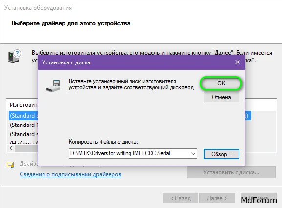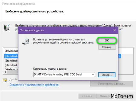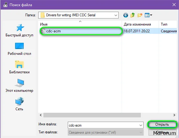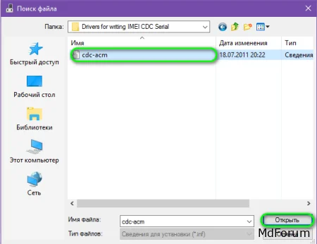 5. Далее нажимаем "Обзор" и в проводнике выбираем файл cdc-acm.ini из папки "Drivers for writing IMEI CDC Serial". Жмём "Открыть" и "OK".