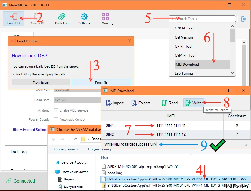 6. Нажимаем "Write" (8) и при успешном результате, радуемся надписи "Write IMEI to target successfully" (9).