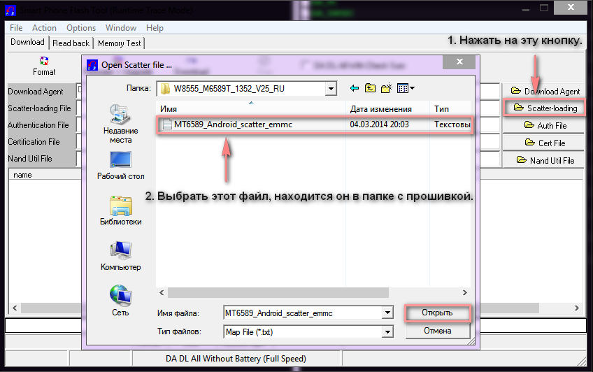 4. Запустить SP Flash Tool. Нажать на кнопку scatter-loading, в открывшемся проводнике выбрать файл MT6589_Android_scatter_emmc.txt, который находится в папке с прошивкой.