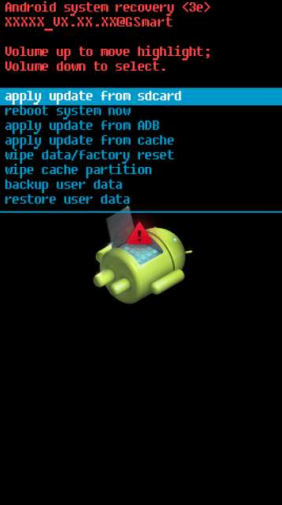 4. Дальше появится меню recovery через которое устанавливается прошивка. Для того чтобы передвигаться по данному меню используйте кнопку "звук +", а для того чтобы подтвердить выбор пункта используйте "звук -".