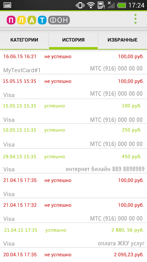 ПЛАТфон предоставляет своим клиентам широкий выбор платежных сервисов по оплате повседневных услуг: пополнение счета мобильного телефона, оплата счетов и квитанций ЖКУ, погашение кредитов в любом банке, оплата штрафов ГИБДД, платежи по свободным реквизитам, денежные переводы и многое другое, всего более 3000 услуг для различных регионов России. Оплачивать услуги можно с карты Visa Master Card (и т.д.) любого банка (принимаются виртуальные карты) из платежного приложения ПЛАТфон для мобильного телефона или воспользоваться деньгами на счету мобильного телефона, что обеспечивает высокую доступность и мобильность услуг.