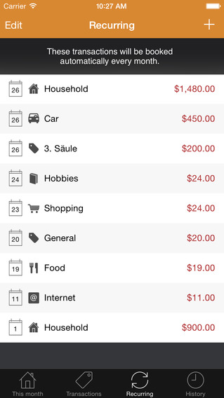 - Все свои платежи вы можете записывать в разделах Expenses (Траты) и Recurring (Повторяющиеся траты).