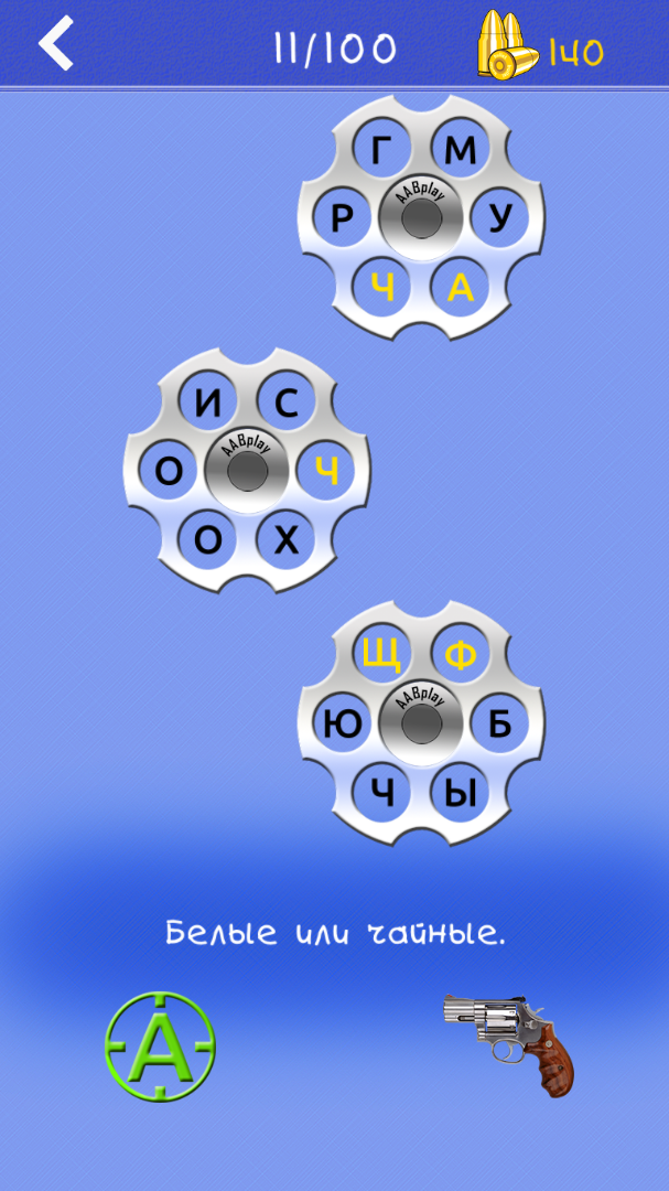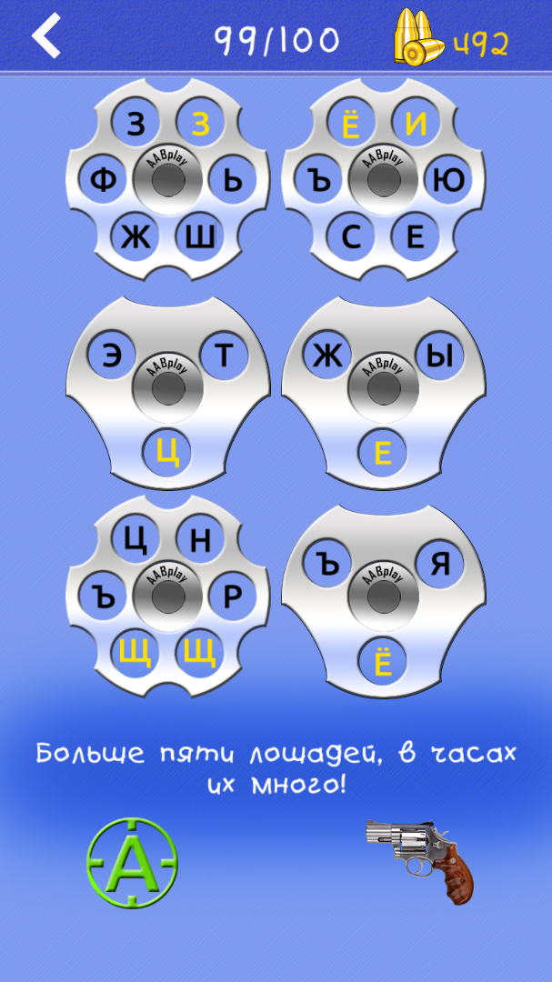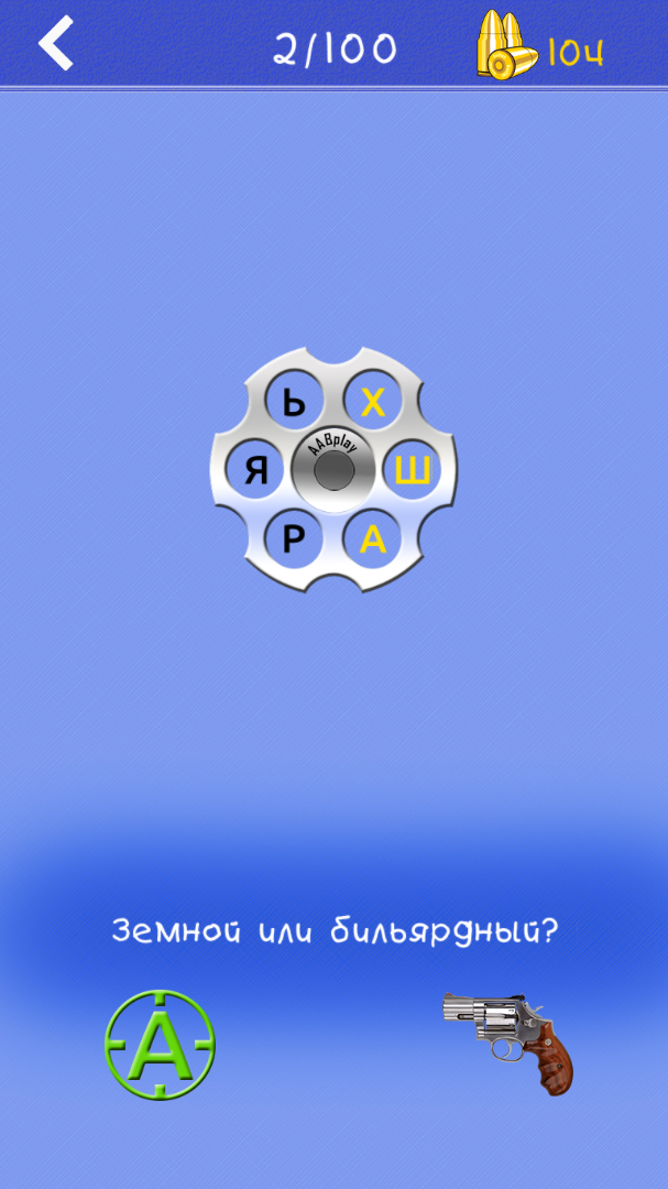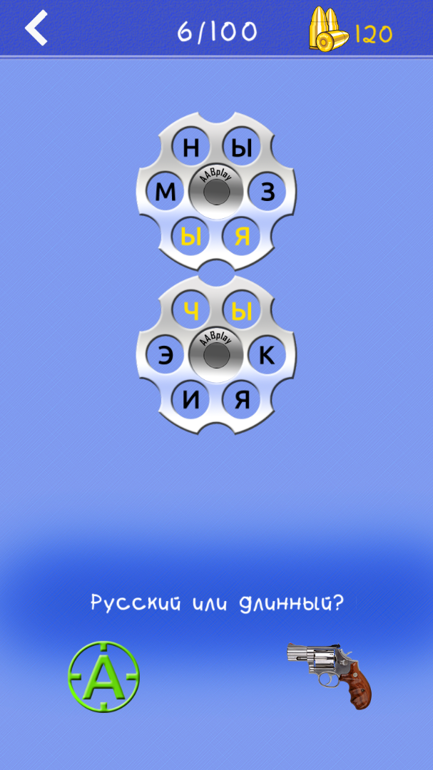 Каждый уровень состоит из вопроса и букв, заряженных в барабаны револьвера. Заряжены как правильные (боевые) буквы, так и неправильные (холостые). Выбор за вами! Если удача, зависящая от смекалки, на вашей стороне - то удачный выстрел позволит перейти на следующий уровень!