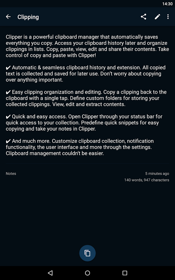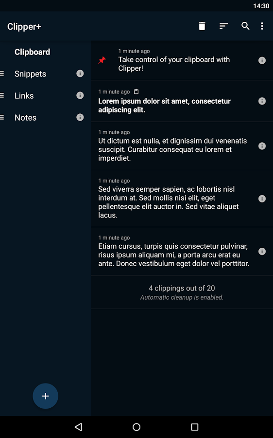 Clipper Plus - простой, но в то же время мощный менеджер буфера обмена для Вашего телефона или планшета. Теперь Вы можете не беспокоиться о потере содержимого Вашего буфера обмена: Clipper автоматически сохраняет все, что Вы скопировали. Просто откройте Clipper в любое время через панель уведомлений для копирования, просмотра, редактирования или вставки заметок, кот. Вы сохранили раннее. Также, Вы можете сохранять и группировать заметки в различные списки. Сохраняйте часто используемые фрагменты текста, в виде заметок, с помощью Clipper, и просто вставляйте их всякий раз, когда они Вам понадобятся. Синхронизируйте всё это в режиме онлайн между несколькими устройствами.