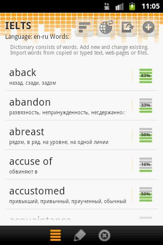 Импортируйте слова отовсюду, переводите их на лету и учите при помощи различных методов изучения. Это так просто открыть сайт или книгу на изучаемом языке и импортировать все содержимое в персональный словарь! Автоматический перевод защитит вас от поиска нужного перевода и вбивания его в словарь, а сервис напоминаний позволит создать собственный план изучения.