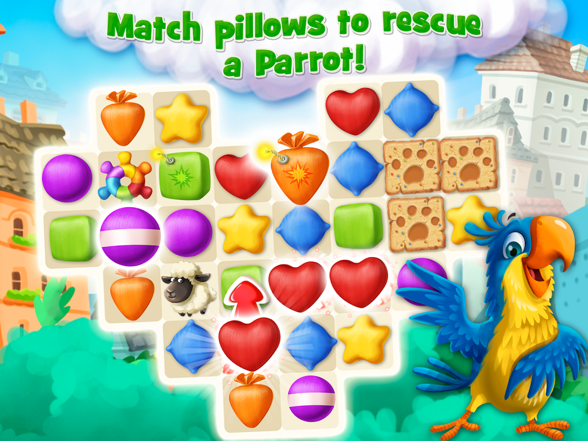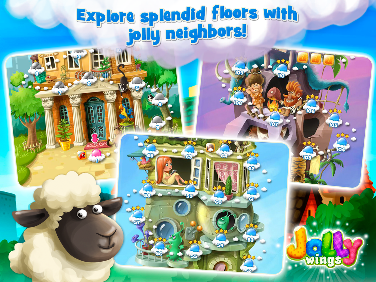 Jolly Wings - казуальная игра, выполненная в жанре «3 в ряд». Располагаемся по удобней, берём в руки ваш android девайс и начинаем захватывающие баталии кота и весёлого попугая. Бесшабашная птичка выпала из окна многоэтажного дома, и ей необходимо как можно быстрее подняться на вверх, пока её не поймали голодные коты. Чем лучше вы играете тем безопаснее попугаю. Принцип игры как и во всех играх этого жанра неизменен. Собираем в ряд одинаковые подушки и одни взрываются оставляя за собой лишь пух. В игре по разным уровням разбросаны бонусы, которые помогут пройти очередной этап.