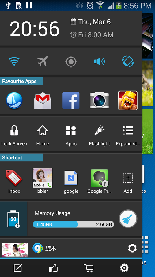 Большинство лаунчеров очень похожи друг на друга и если хочется чего-то особенного, то найти подходящий вариант бывает сложно. А вот Sidebar Launcher действительно не похож на своих конкурентов. Главная особенность приложения — наличие кастомизируемой боковой панели, которая будет доступна как на рабочих столах, так и в открытых приложениях. На эту панель выводятся так называемые карточки — приложения или функции, собранные по тематикам, отсюда их можно быстро запускать. Доступны карточки с текущей датой и временем, быстрыми настройками, часто используемыми приложениями, некоторыми важными функциями (блокировка экрана, меню приложений, фонарик и др.), информацией о заряде батареи и многое другое. Отметим, что некоторые функции (переход в меню и кнопка "назад") доступны только при наличии root-прав.