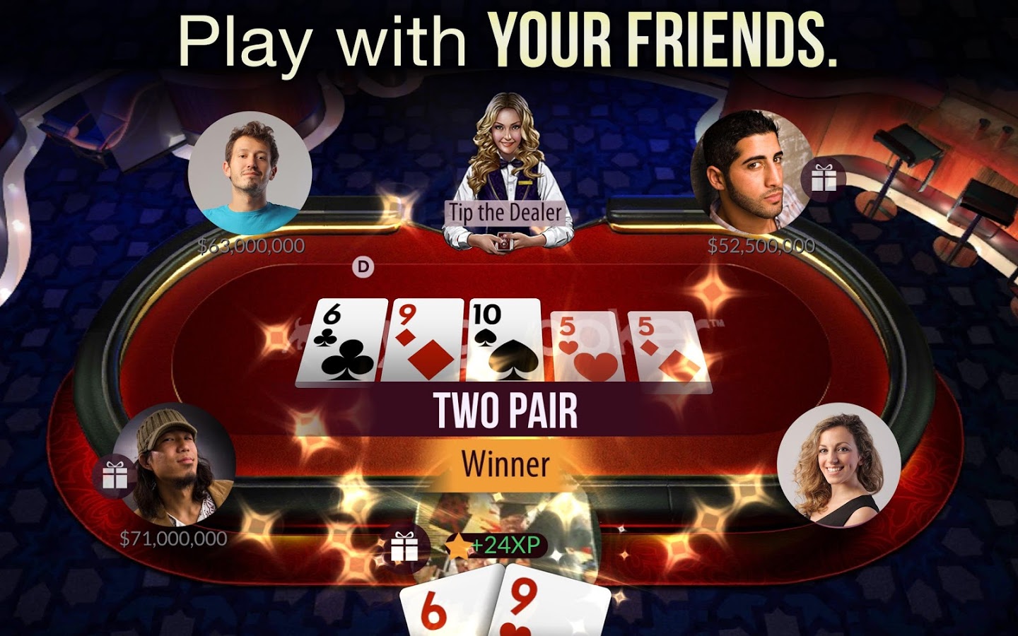 Zynga Poker – предлагает всем знакомый аутентичный опыт игры в покер с утонченным дизайном, наряду с новыми функциями, которые помогут вам составить конкуренцию и поднять собственное мастерство. Присоединяйтесь к игре №1 по Texas Hold 'Em Poker. Вы можете играть с друзьями или же попытать удачу с миллионами других игроков каждый день. Будь вы новенький или же закалённый игрок, Zynga Poker поможет вам найти или же отточить свой стиль игры, а современный внешний вид и качественные анимации помогут расслабиться, и перенесут вас прямо за игровой стол.