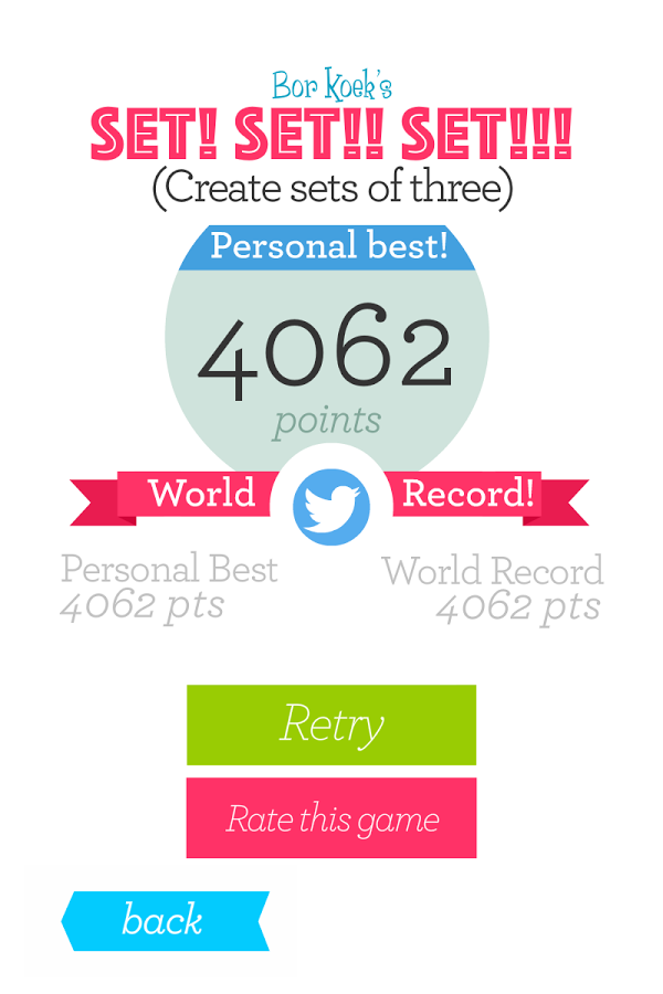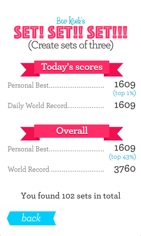 Set Set! Set!! – игра головоломка на андроид, в которой вы потренируете свой мозг и весело проведете свое свободное время. В этой игре вашей главной задачей будет собирать геометрические фигуры так, чтобы они были одинаковые по форме, либо по цвету или штриховке. Попробуйте собрать как можно больше совпадений и заработать максимальное количество очков. Тренируйте свой мозг, реакцию и скорость мышления и поборитесь со своими друзьями за лучшие результаты. Делитесь своими достижениями в Twitter и поставьте свой собственный рекорд в этой игре. Играйте, и с пользой проводит свой досуг.