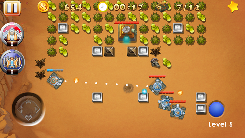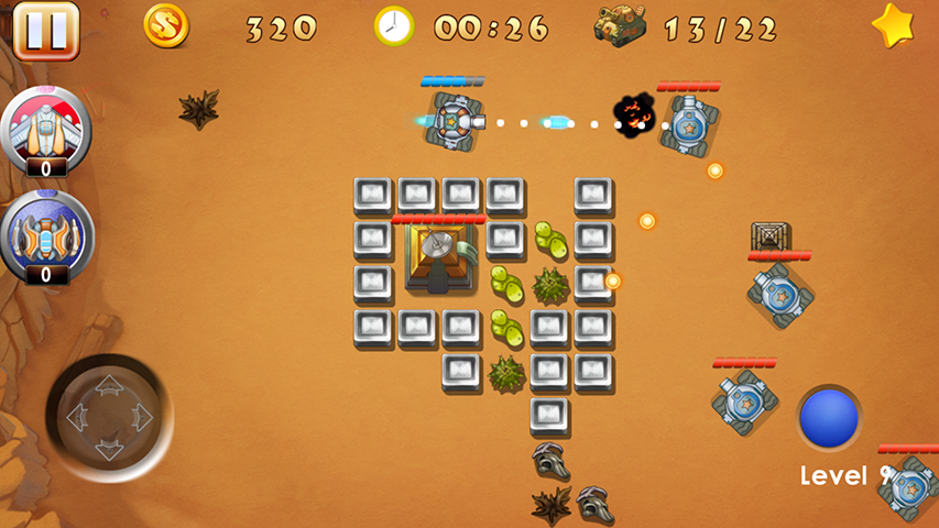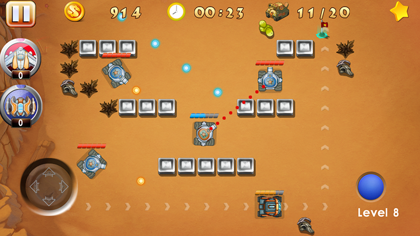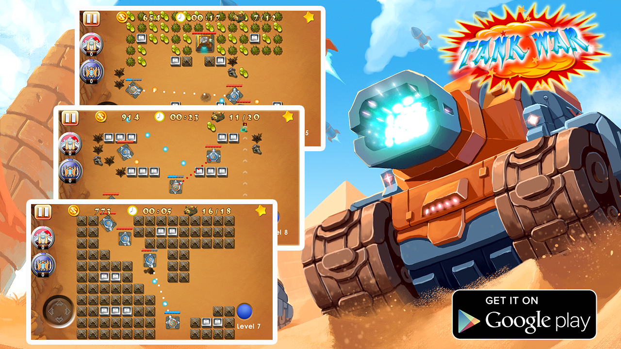Tank War - Battle City – защитите свою базу от натиска врагов в этой увлекательной игре на андроид. В этой игре вы будете управлять современным танком, и защищать свою базу от армии противников. Ваши враги находятся в верней части экрана, обстреливайте их с помощью мощного оружия и делайте все возможное, чтобы не погибнуть. Вашей задачей будет уничтожить 20 танков противника на каждом уровне, сложность состоит в том, что жизней у вас ограничено, а врагов очень много и они все рвутся в бой. Совершайте умные маневры, прячьтесь за укрытиями и покажите все свои навыки планирования и тактики. Применяйте оружие для уничтожения вражеских укрытий и собирайте приятные бонусы, разбросанные по всему полю.