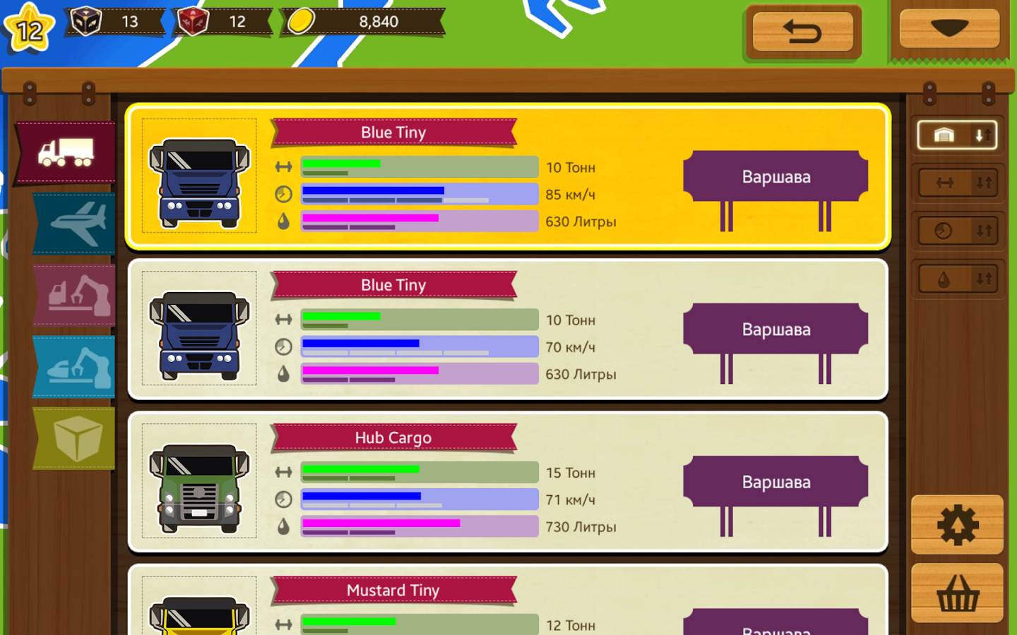 - В зависимости от характеристик, каждый из грузовиков и самолетов можно улучшить до разных уровней.