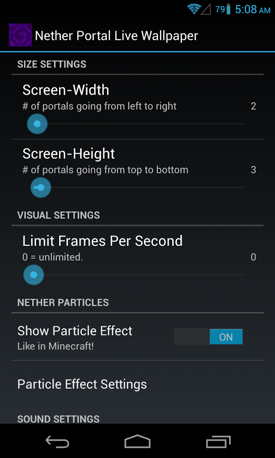 Nether Portal Live Wallpaper – живые обои на андроид, созданные в стиле Minecraft. Благодаря этим обоям на вашем экране телефона или планшета появится абстрактный мир, который будет завораживать вас своими эффектами. Меняйте настойки и устанавливайте их по своему усмотрению для того, чтобы получить завихрения, большое количество падающих частиц и многое другое. Сделайте свои обои уникальными, подобрав для них подходящий цвет, а также смешивая и сочетая различные эффекты. Установите эти живые обои прямо сейчас и наслаждайтесь приятной пиксельной графикой и широким выбором настроек.
