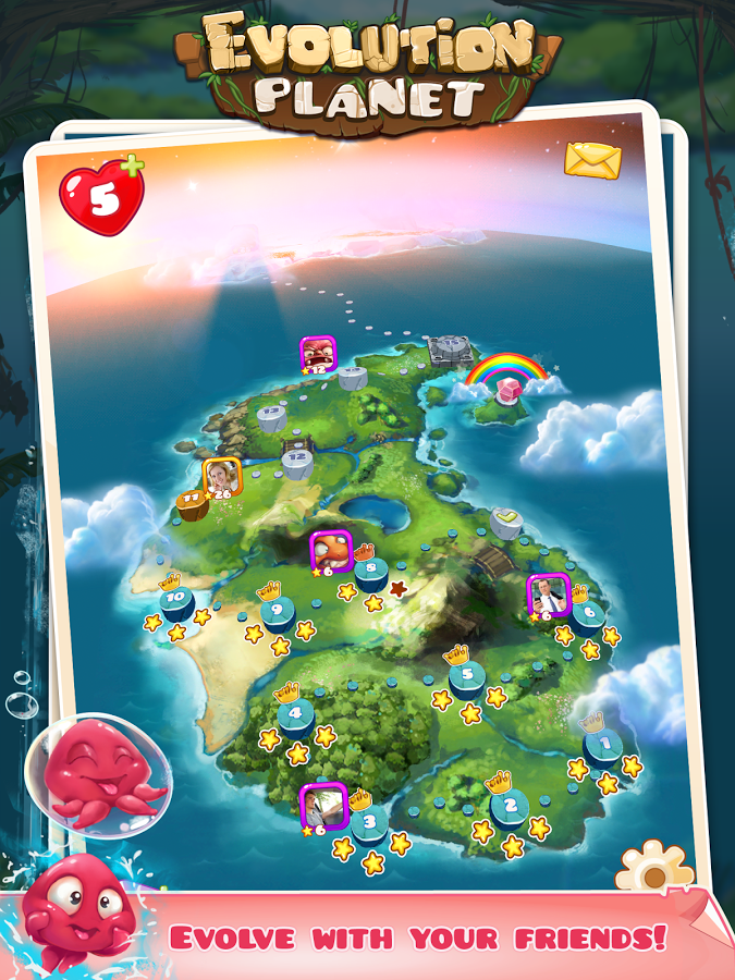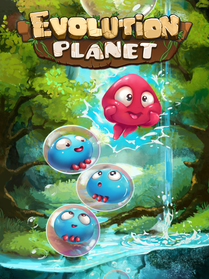 Evolution Planet – игра подарит вам незабываемые ощущения радости. Отправляйтесь в приключения на поиски сокровищ вместе с весёлыми жителями болот и водоёмов. Проходя уровни мы передвигаемся с одного острова на другой. Если мы совместим три объекта одинакового цвета то они эволюционируют в другое существо, и так пока не превратятся в лягушек. Откройте все виды существ, доступных в игре: три амебы - получится медуза, три медузы – выйдет лягушка. Три лягушки эволюционируют в … и так, пока не появится динозавр. 6 великолепных, красочных островов ждёт своего игрока. В игре присутствуют боссы.