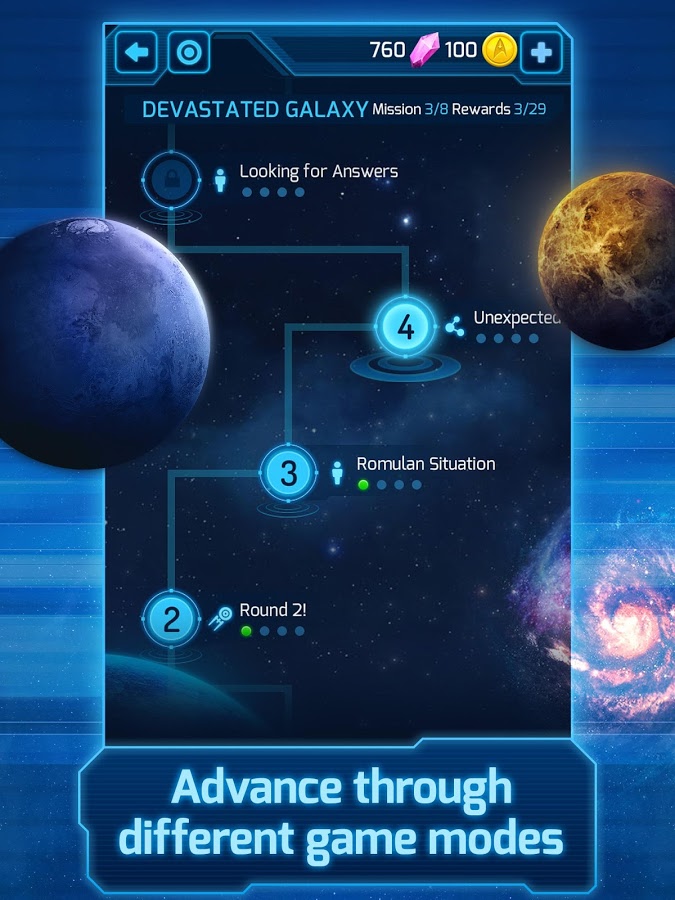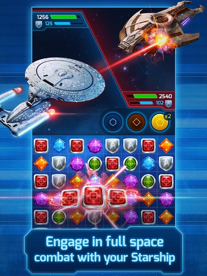 Star Trek - Wrath of Gems – отправляйтесь в незабываемое путешествие, бороздя космические просторы вместе с знаменитыми героями сериала «Звёздный путь». Выбирайте себе подходящий корабль и набирайте для него команду героев, которые пройдут с вами этот нелегкий путь. Складывайте и составляйте одинаковые кристаллы в ряды и наносите врагам сокрушительные удары, это позволит вам также защититься от огня противников. Исследуйте бескрайние просторы галактики, сражайтесь с врагами и улучшайте свой корабль, модернизируя его или приобретая новый. Впереди вас ждет множество различных уровней, три режима игры и знаменитые герои.