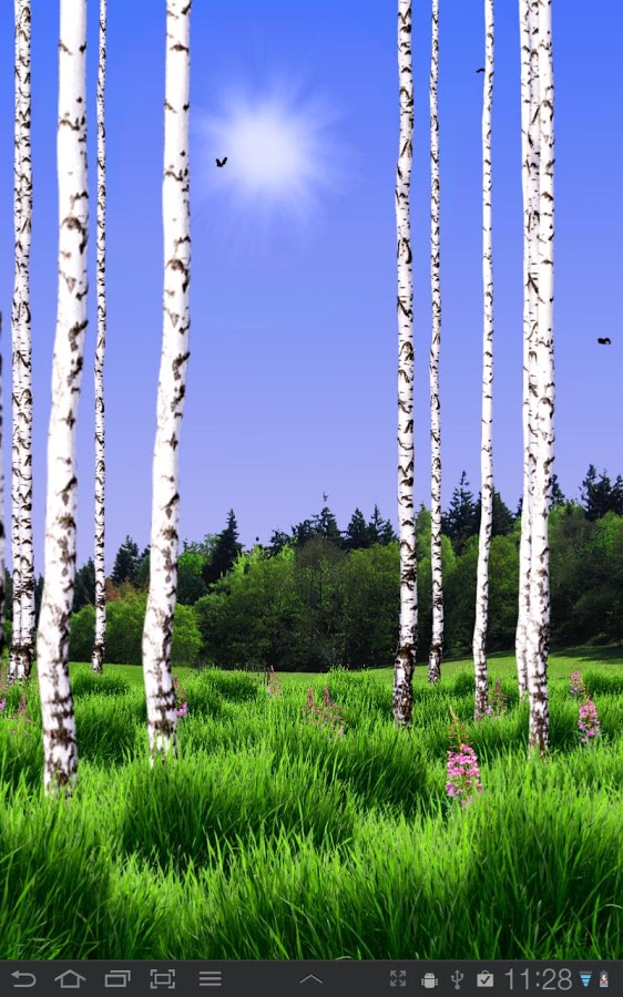 Birch Wood Live Wallpaper – живые обои на андроид, благодаря которым на вашем экране появятся белые березки. Если вы любите лес, который целиком и полностью состоит из берез, то эти обои для вас. Установив обои в свой телефон или планшет, вы окажетесь в лесу, покрытым травой с растущими повсюду березами, вас будет окружать пение птиц и шелест листьев. Обои будут меняться в зависимости от времени суток, балуя вас ярким солнышком или чаруя красочным закатом и луной. Установка обоев не займет у вас много времени и места в памяти, но зато вы получите красивые пейзажи бескрайних лесов и метеоритных дождей.