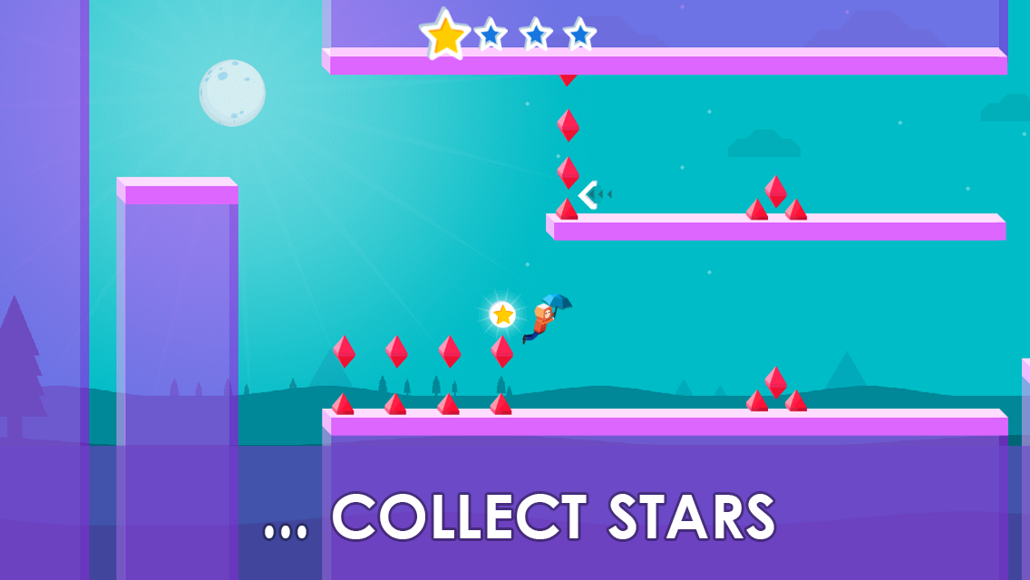 Umbrella Jump – таймкиллер на андроид, где вам предстоит управлять бегающим героем с зонтиком. Эта игра порадует вас разнообразными уровнями с многочисленными препятствиями, которые вам предстоит преодолевать. Бегайте, прыгайте и применяйте зонтик, чтобы парить с крыши на крышу и обходить острые шипы, при соприкосновении с которыми вы отправитесь в начало игры. Соберите по четыре звезды на каждом уровне и попробуйте разблокировать нового персонажа. Попробуйте дойти до конца игры и поставить свой рекорд по скорости и времени прохождения игры. Перемещайтесь по различным красочным уровням и собирайте как можно больше бонусов.