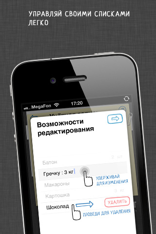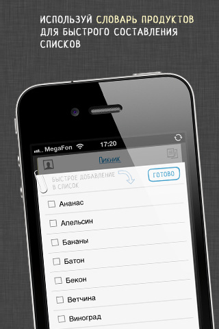 Вы сможете синхронизировать созданные в программе списки между всеми вашими мобильными устройствами и «подкидывать» нужные покупки в корзину на лету. Тщательно продуманные функции и привлекательный внешний вид приложения «Купи батон» позволит вам получить удовольствие от самого обычного похода по магазинам!