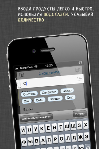 — быстрое добавление элементов списка с удобным вводом наименования покупки и требуемого количества;