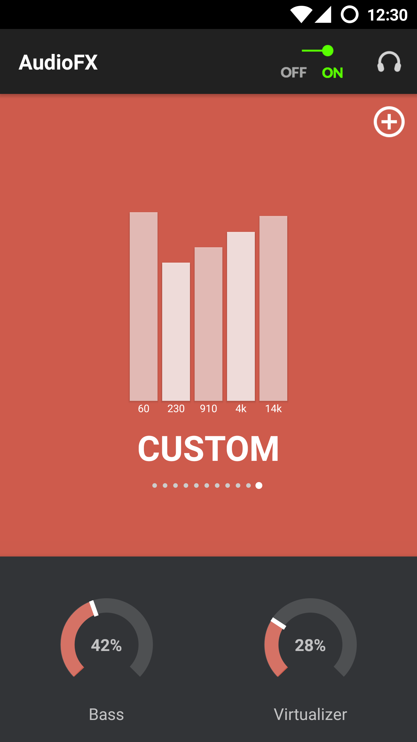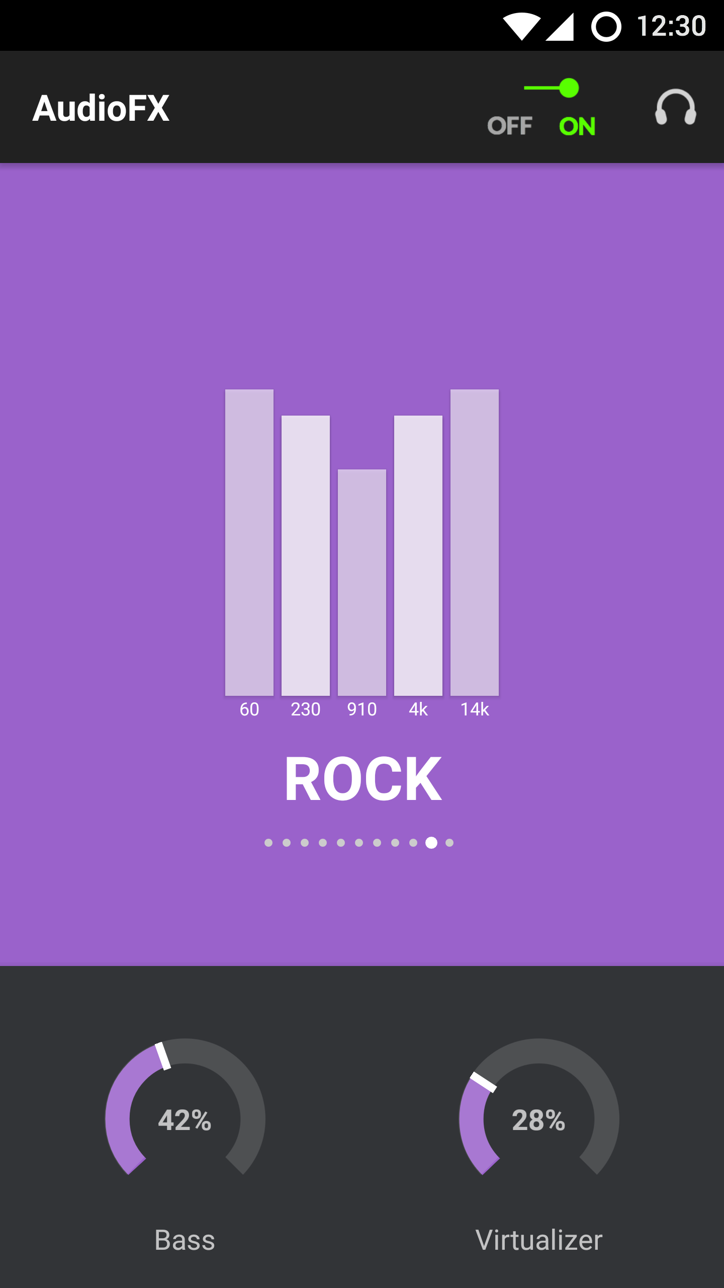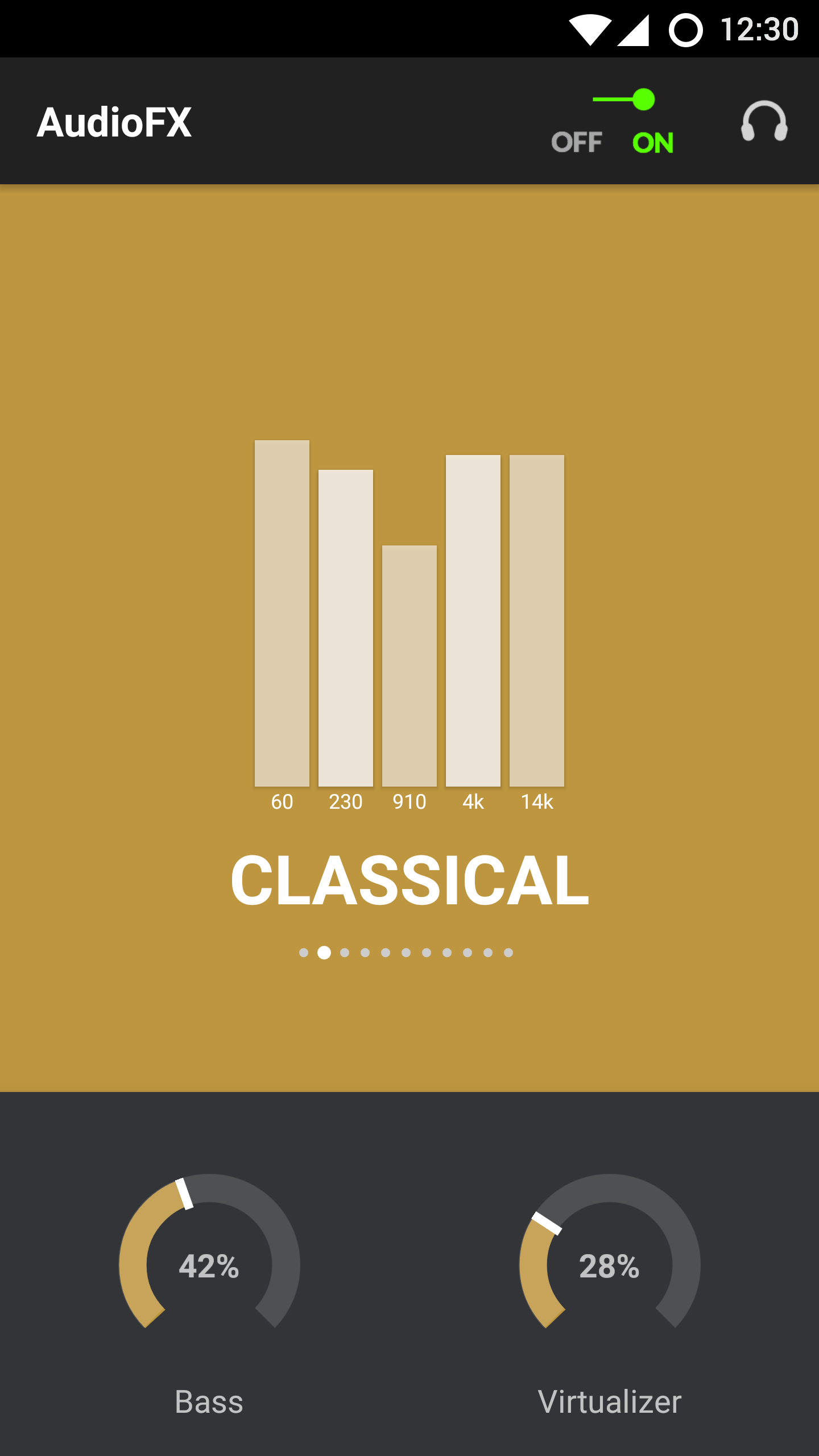 Приложение Audio FX позволяет с лёгкостью настроить качество звучания устройства. AudioFX поддерживает аудиофайлы высокого качества (24 бит) с усилением низких частот, объёмного звучания, реверберации и позволяет как переключаться между готовыми пресетами, так и создавать свои.