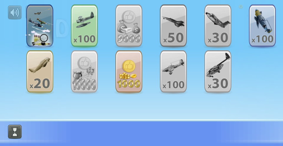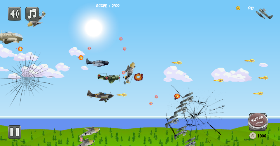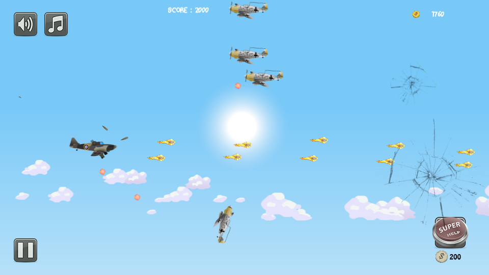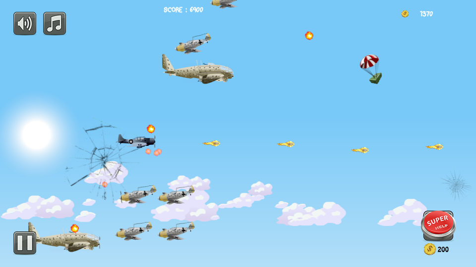 Накапливай монеты и алмазы для покупки дополнительных жизней, либо вызова двух самолётов-помощников!