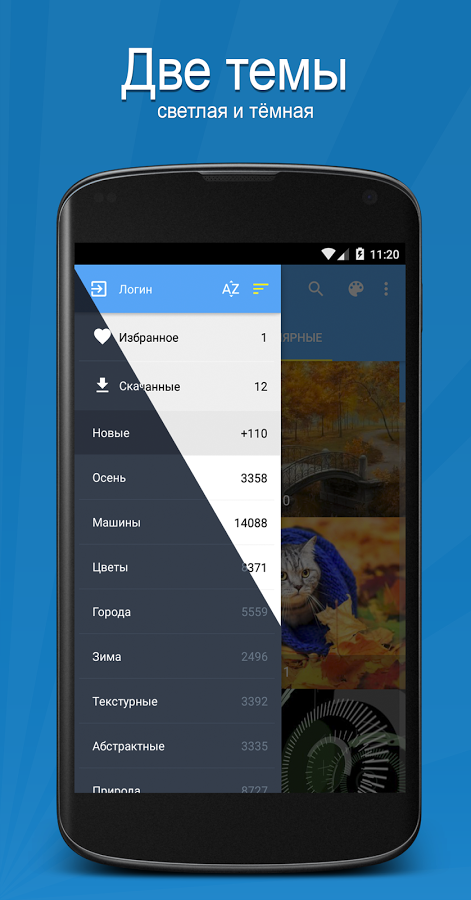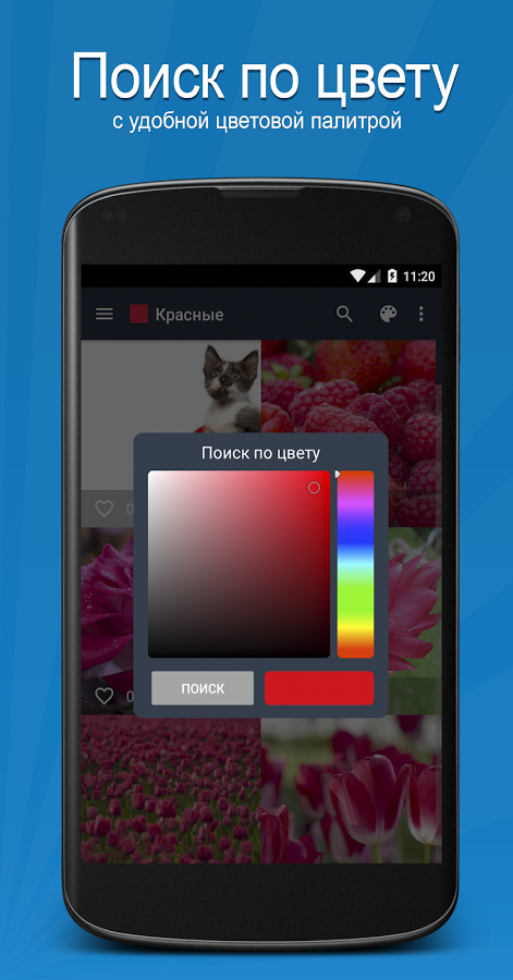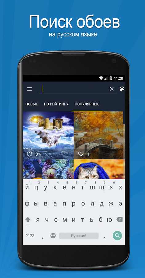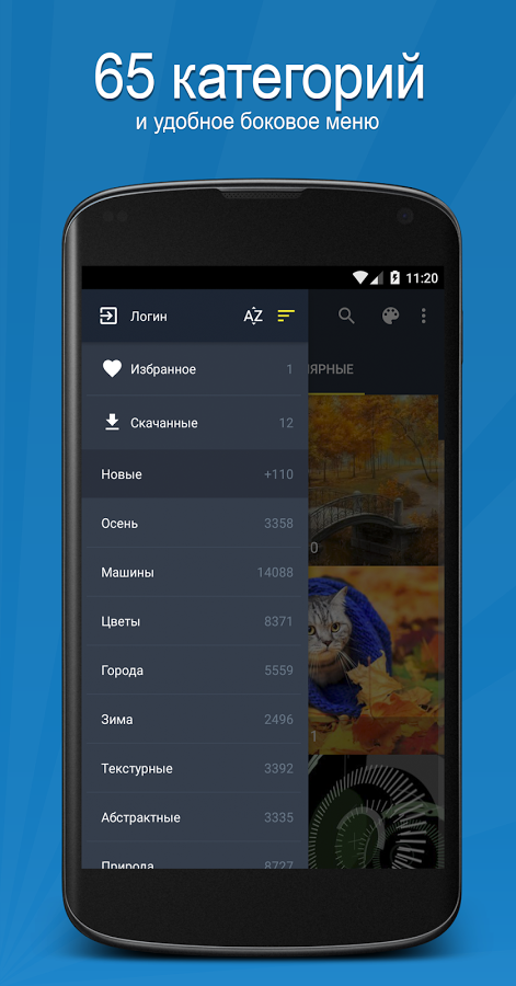 Умная система поиска поможет Вам подобрать именно те обои, которые вы хотите установить на свое мобильное устройство. В неё также входит инновационная технология поиска по цветовой палитре, облегчающая поиск картинок нужного Вам цвета. Удобное боковое меню содержит 65 разделов, благодаря которому Вам будет легче ориентироваться в каталоге. Определившись с картинкой вы можете её скачать, добавить в избранное или сразу установить как фоновую заставку.