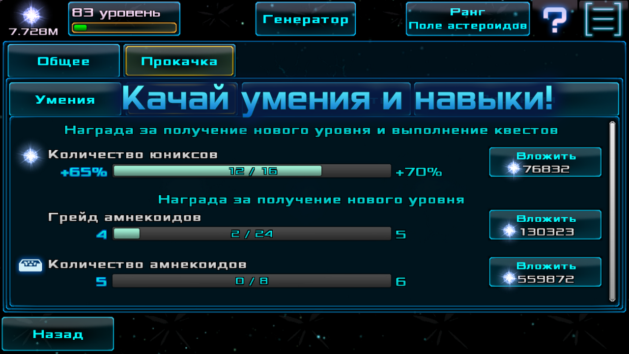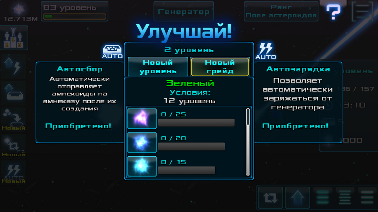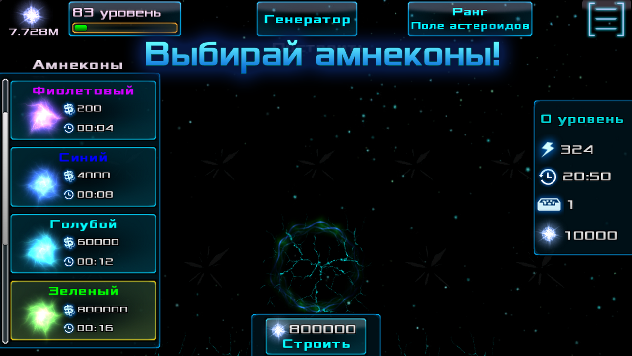 Эта интересная игра позволит вам развивать свой фантастический бизнес. Вы станете частью великой Амнеки и поможете ей создавать вещество и энергию для вселенной. Космос нуждается в вашей помощи. Помогите в сотворении планет, звезд и целых галактик!