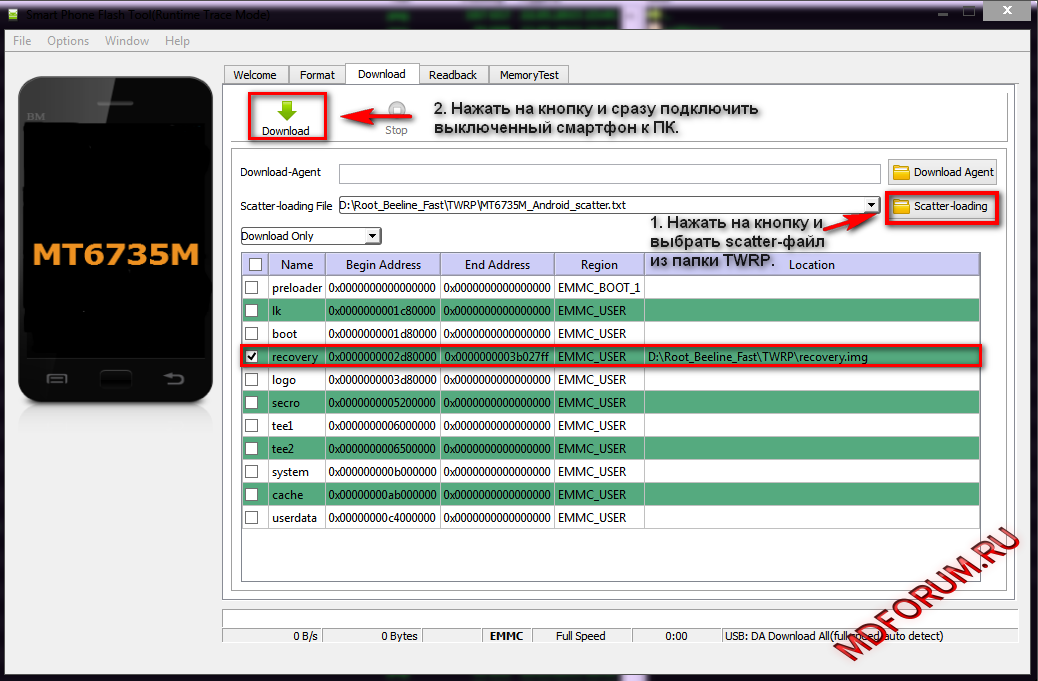 6. В окне программы нажать на кнопку scatter-loading и выбрать файл MT6735M_Android_scatter.txt из папки TWRP.
