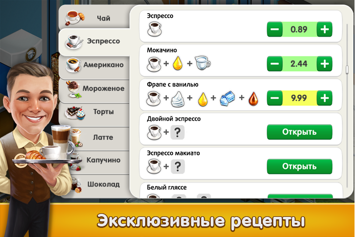 • Придумывайте новые рецепты кофе, чая и других блюд, радуйте гостей вкусными напитками, и тогда ваша кафешка станет самой популярной в городе!