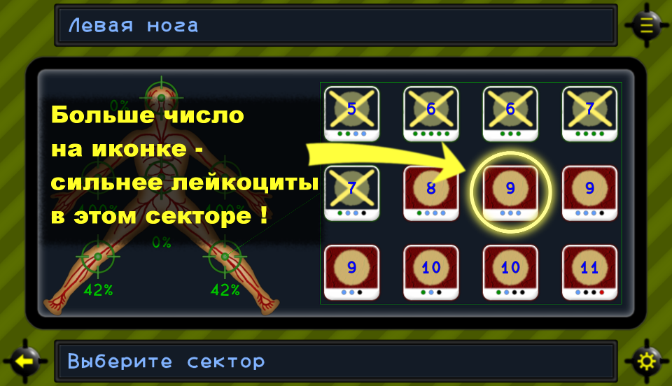 Задача игрока - помочь этим микробам побороть сопротивление иммунитета, то есть помочь им уничтожить лейкоцитов в ключевых точках организма.