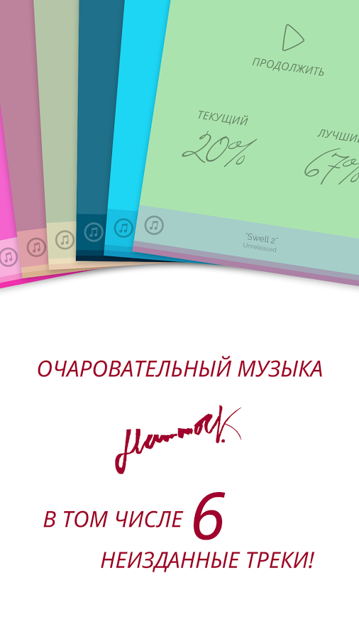 Цветовая палитра едва ощутимо преобразуется у вас на глазах. Игровые элементы замирают и танцуют под прекрасную музыку. Разные уровни сложности стимулируют мозг, а яркие краски и приятная музыкальная атмосфера расслабляют и вводят почти в гипнотический транс. Попробуйте и вы сами все поймете!