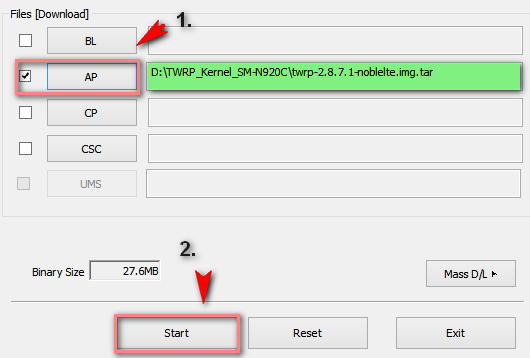 7. Запускаем Odin3 v3.10.6.exe. Ставим галочку на против пункта AP, жмём на кнопку и выбираем файл twrp-2.8.7.1-noblelte.img.tar