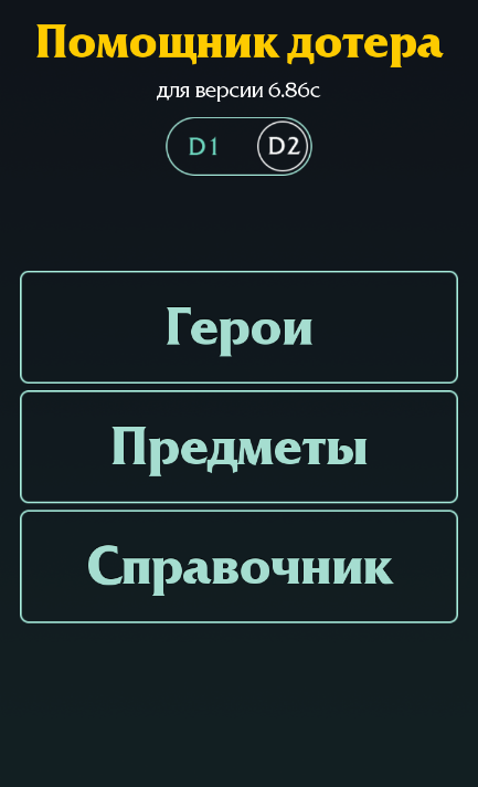 Приложение для игроков в Dota (Defense of the Ancients) и Dota 2. Подскажет какие предметы покупать героям, поможет выбрать прокачку, а так же подскажет некоторые секреты тактики в игре. Очень удобно использовать прямо во время игры на своем мобильном устройстве. Приложение поможет быстро сориентироваться при игре за незнакомого Вам героя, и не показаться чайником, даже если какой-либо герой попался впервые.