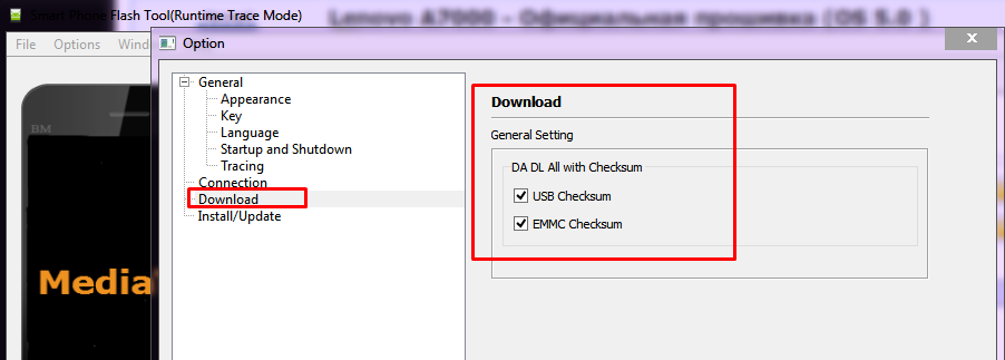 5. Зайти в папку SP_Flash_Tool_exe_Windows_v5.1520.00.000 и запустить файл flash_tool.exe, запустится программа-прошивальщик. Открыть опции в программе (Options) и поставить галочки на против пунктов DA DL All With Check Sum в подменю Download (скриншот в этом посте)