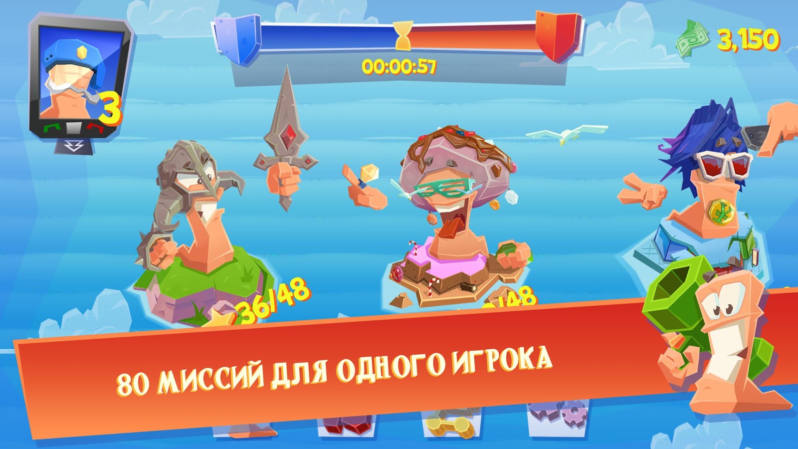 • 80 миссий в одиночной игре: Проверь свои навыки на деле, выполнив восемьдесят миссий в одиночной игре. Эти миссии не только подарят тебе много часов чистого удовольствия, но и помогут освоить тонкости стратегии игры Worms!