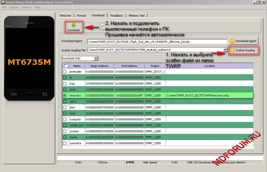 1. Скачать архив TWRP_ROOT_5017D.rar из вложения к посту, распаковать. 2. Установить драйвера из папки drivers вручную | Инструкция (ставятся на выключенный телефон) 3. Поместить архив BETA-SuperSU-v2.68-20160228150503.zip в корень карты памяти. 4. Запустить SP Flash Tool (flash_tool.exe) 5. Нажать на кнопку scatter-loading и выбрать файл MT6735M_Android_scatter.txt из папки TWRP. 6. Нажать на кнопку Download и сразу подключить выключенный телефон к ПК, если драйвер установлен, то прошивка TWRP начнётся автоматически. Дождаться завершения, в конце выскочит окошко с зелёной "птичкой". 7. Закрыть программу и отключить смартфон от компьютера. 8. Зажать на выкллюченном телефоне кнопку увеличения громкости и не отпуская её включить телефон, кнопку громкости держать до входа в TWRP recovery. 9. В TWRP выбрать пункт Install -> далее архив BETA-SuperSU-v2.68-20160228150503.zip и установить его проведя пальцем внизу экрана. 10. После установки архива выбрать пункт reboot system. Телефон загрузится в систему уже с рутом.