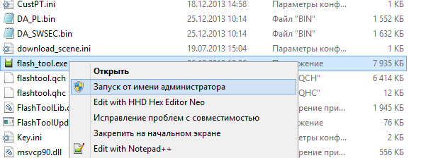 2. Скачайте архив SP_Flash_Tool_v5.1352.01.zip (внизу инструкции) и распакуйте его, после чего зайдите в распакованную папку и найдите там файл flash_tool.exe. Запускаем данный файл с правами администратора (клик правой мышкой -> запуск от имени администратора).