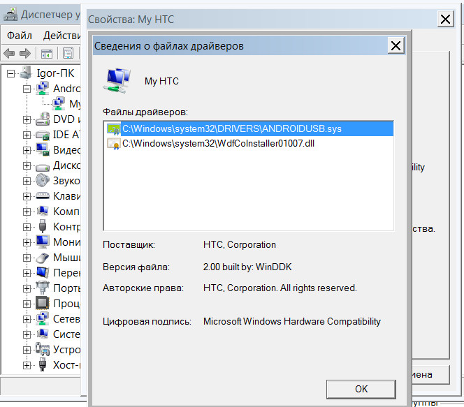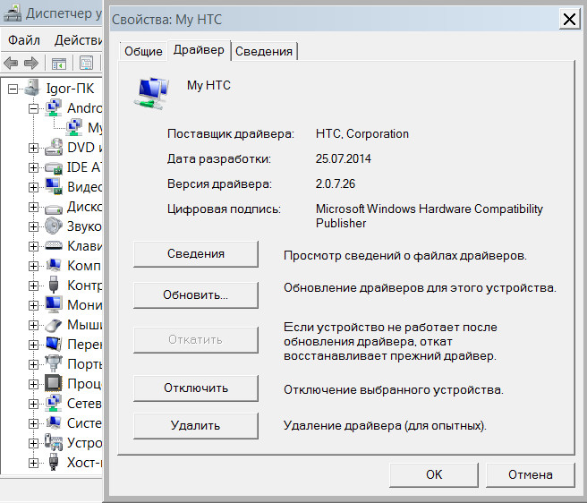 Планшет в диспетчере устройств (Win 7 максимальная) обозначен как Android USB Devices и - в подпапке - My HTC (см. скриншот). Естественно, подходящий драйвер установлен и не нуждается в обновлении.
