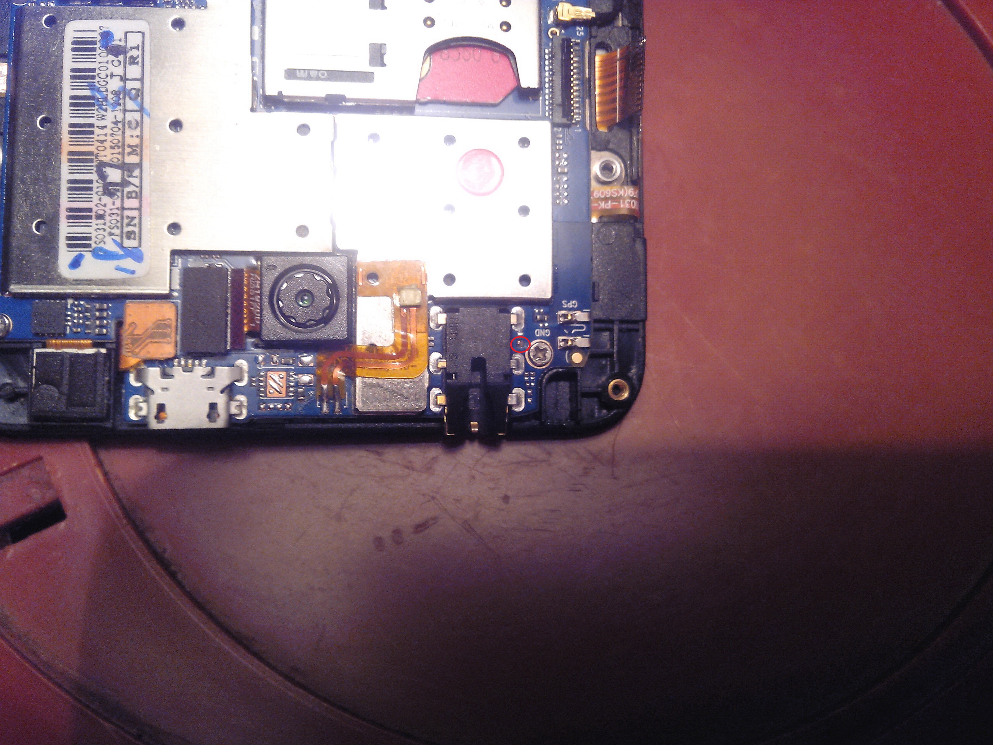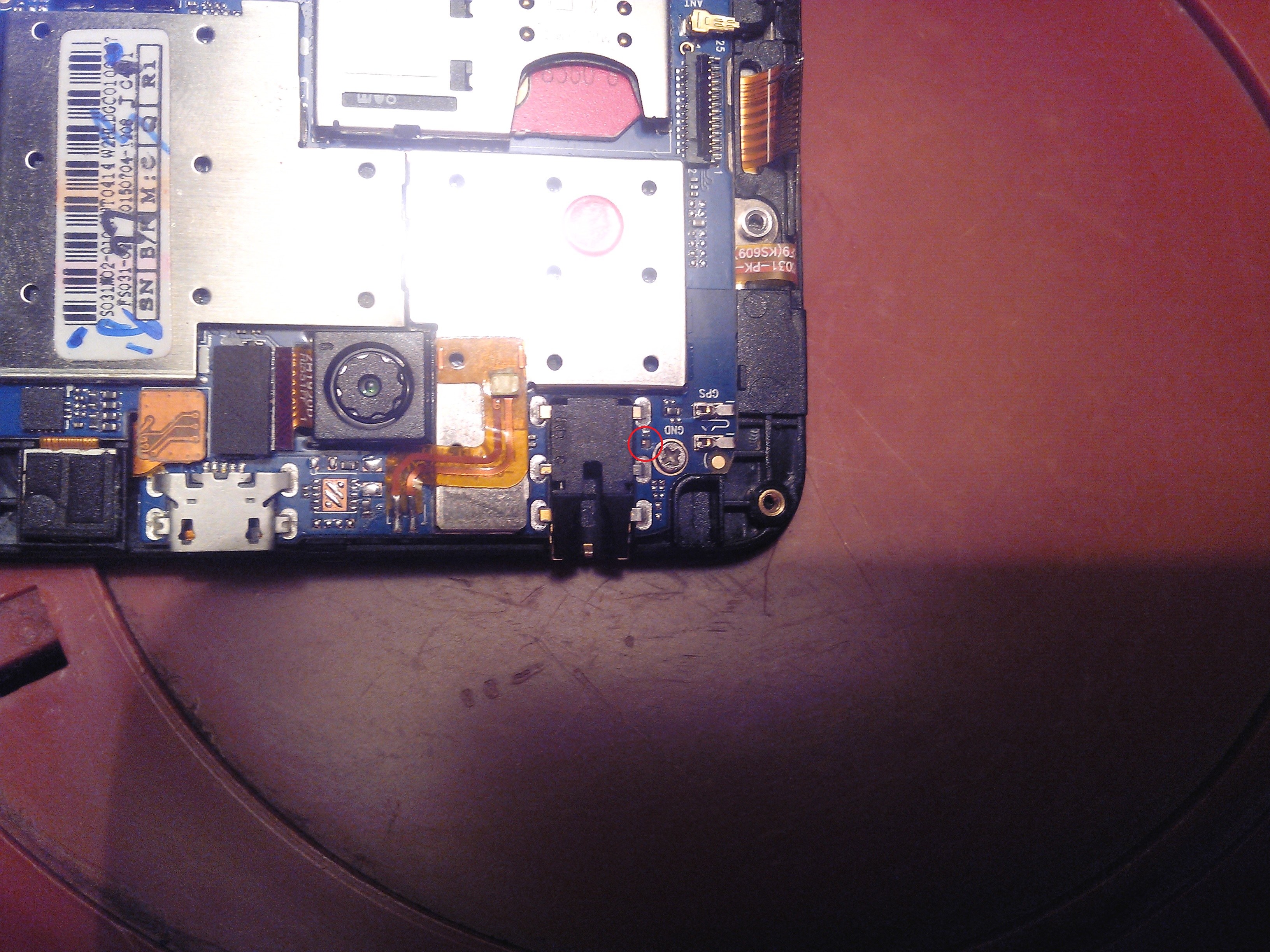 Здравствуйте! Очень нужна помощь.Телефон Texet x-line tm 5006 ,был подмочен под дождём.При включении вибрировал,но экран не загорался,при подключении к ПК определялся отлично.Я разобрал и тщательно осмотрел, заметил что на одном шлейфе коррозия съела один контакт.Помучался и смог припаять очень тонкую проволочку в месте разрыва контакта.Экран при включении зажегся,но были небольшие артефакты,телефон проработал где то час и экран погас, при этом был запах гари радиодеталей.Опять разобрал и осмотрел,нашёл обугленную точку (рядом с винтом)указанную на фото красным кружочком.Что это, я не представляю, так как далёк от этой темы,но руки - не в попе...Прошу подсказать, а лучше показать,если есть возможность- что было на этом месте,какая радиодеталь??? У меня есть старые материнки, может подберу чего.Буду очень благодарен за ответ.