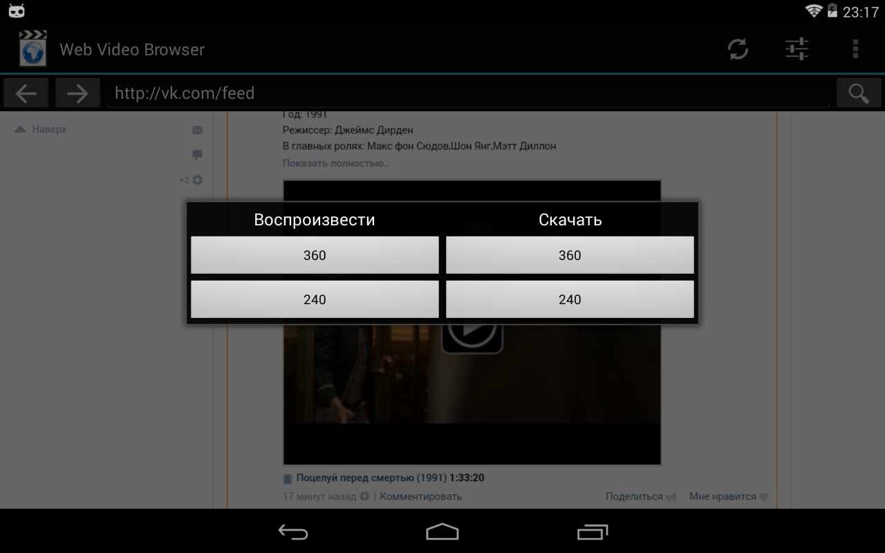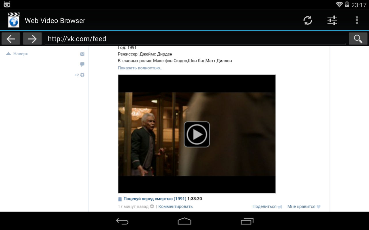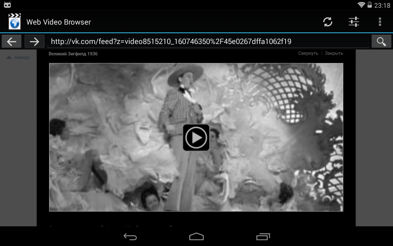 Web Video Browser - это упрощённый браузер, который позволяет смотреть видео из социальной сети ВКонтакте в своём любимом видео плеере - ES Player, MX Player или др. Дополнительно поддерживается обработка HTML5 видео, YouTube iframe, плеера от HDSerials.