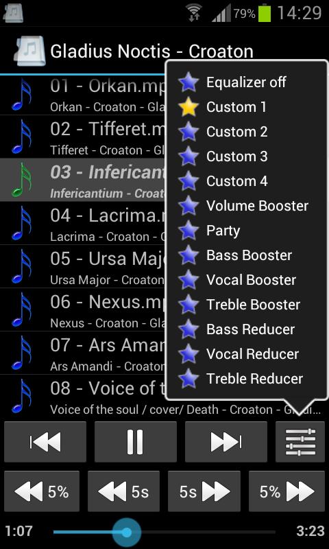 Проигрывание музыки папками. Список воспроизведения в нем базируется на папках. Удобно для тех, кто постоянно переключается между музыкой и аудио-книгами или подкастами. Возможности: отображение списка аудио-файлов для каждой папки отдельно; быстрое переключение между папками; настройка размера шрифта; перемешивание файлов в папке/ во всех папках. А также отображение обложек, если в папке есть обложка в формате Jpeg и много других настроек.