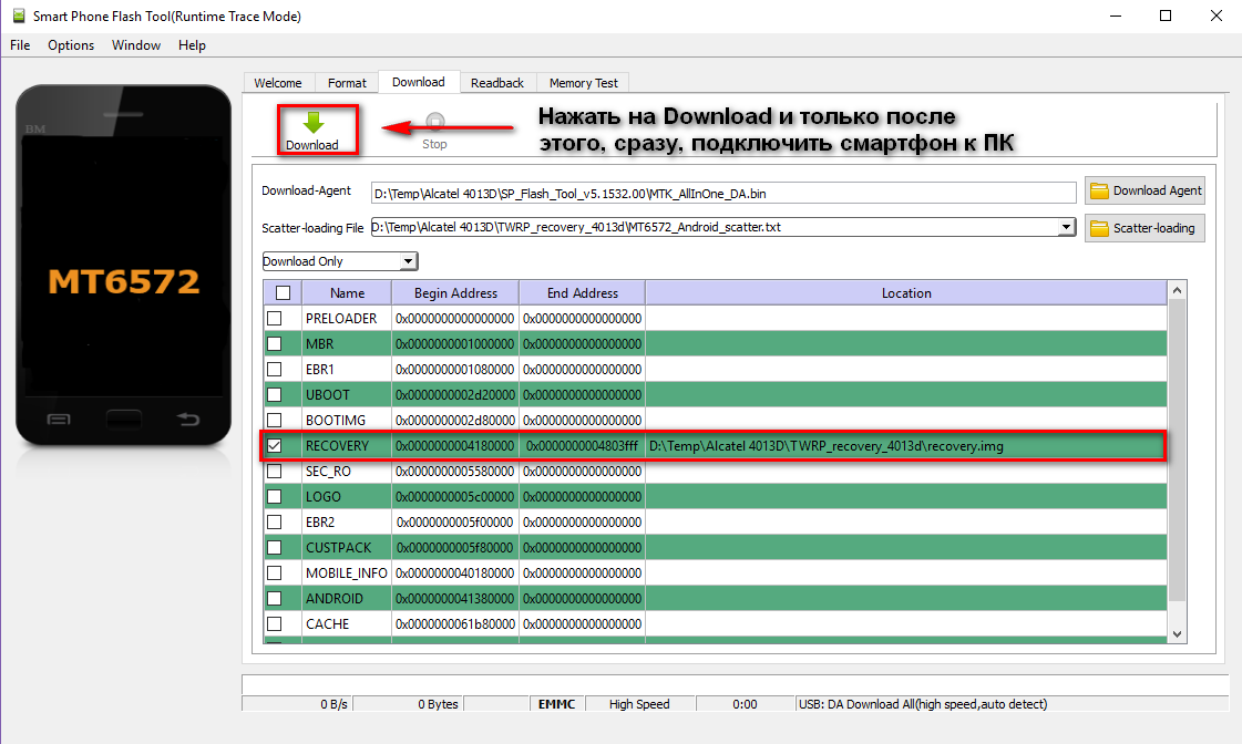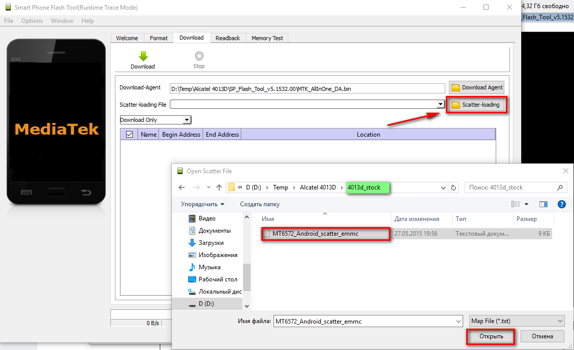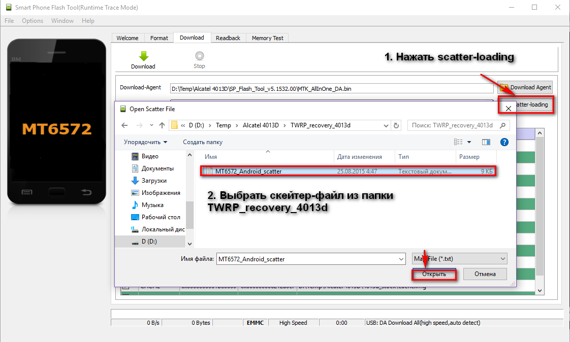 3. Запустить SP Flash Tool, нажать кнопку scatter-loading и выбрать файл MT6572_Android_scatter.txt из папки TWRP_recovery_4013d