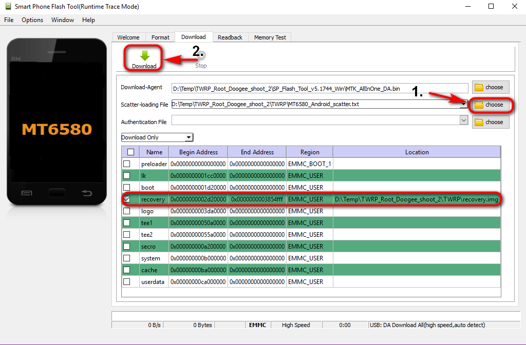 1. Скачать архив TWRP_Root_Doogee_shoot_2.zip. Распаковать на компьютере. 2. Архив SuperSU.zip поместить на флешку телефона. 3. Установить драйвера https://mdforum.su/showthread.php?t=25884 4. Выключить телефон. 5. Запустить SP Flash Tool. Нажать кнопку choose (напротив поля scatter-loading) и выбрать файл MT6580_Android_scatter.txt, который находится в папке TWRP. 6. Нажать кнопку Download и сразу подключить выключенный телефон к ПК, если с драйверами всё ОК, то прошивка рекавери начнётся автоматически. Дождаться окошка с зелёной галочкой и отключить телефон от ПК.