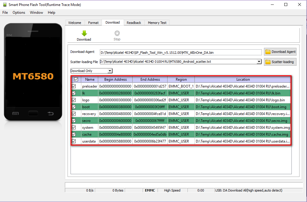 1. Скачать архивы SP_Flash_Tool_Win_v5.1512.00.zip и Alcatel_4034D_Drivers_VCOM.zip из вложения к этому посту. Распаковать. Также распаковать архив и с прошивкой.