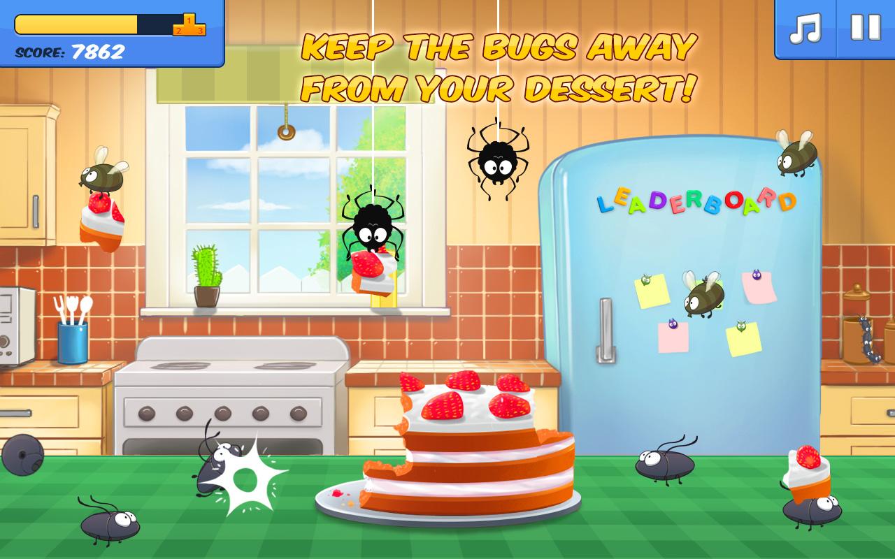 В игре вам предстоит защищать свои лакомства от злых и голодных насекомых. С помощью пальца давите насекомых приближающихся к сладостям, они с каждым уровнем становятся все быстрее, так что вам придется приложить всю свою ловкость. Начните свою оборону с торта и по очереди открывайте все лакомства, а их будет очень много: кексы, печенья, желе, конфеты и пироги.