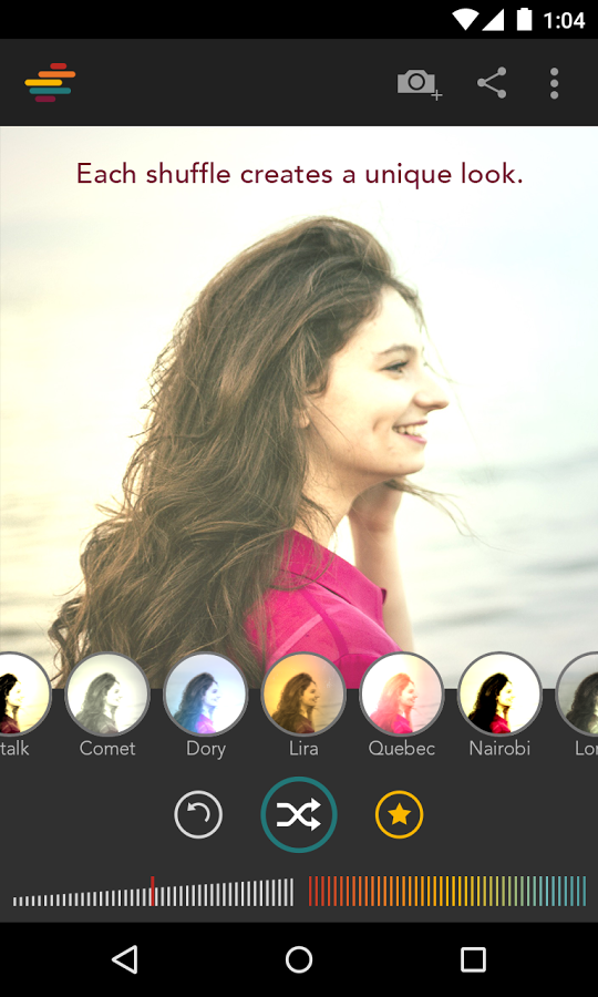 Почувствуйте себя профессиональным фотографом, используя данное приложение. Здесь использована новейшая система подбора цветов и фильтров для ваших фотографий. Выберите один из готовых вариантов или же создайте свой собственный. Управление фильтром довольно простое, у вас будет три основных точки, при перемещении которых будет меняться значение фильтра. Вы можете сдвигать его, передвигая сразу все точки, или же двигать их отдельно, тем самым меняя одно из значений. Не нужно ограничивать себя скудным набором готовых фильтров, которые созданы не вами. Создайте свои собственные уникальные и крутые фильтры.