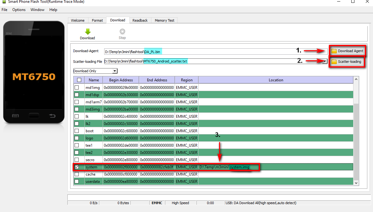 6. Запустить FlashTool. В Download Agent выбрать DA_PL.bin, в scatter-loading - MT6750_Android_scatter.txt. Отметить галочкой только блок system, щёлкнуть рядом (в столбе location) двойным щелчком мыши и выбрать файл system.img. Всё должно выглядеть так, как на скриншоте: